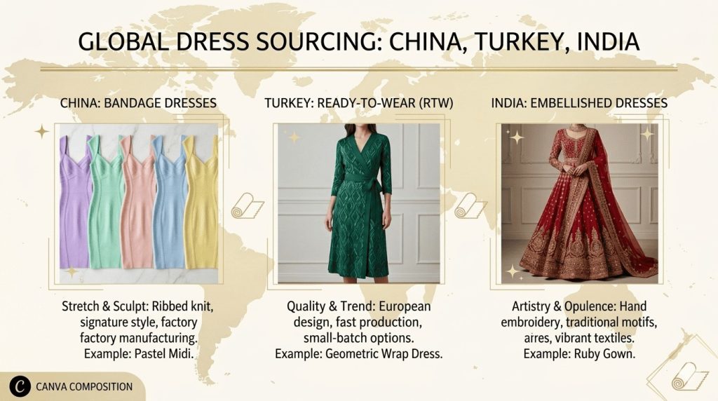 This guide compares the three countries that, together, account for the lion’s share of the world’s wholesale dress supply: China, Turkey, and India. We will look at honest pricing, realistic MOQs, lead times, quality reputation, and — most importantly — which country actually fits your market, because a buyer in Sydney has very different needs than a buyer in Monterrey or Berlin.